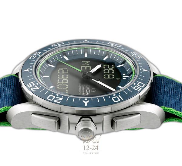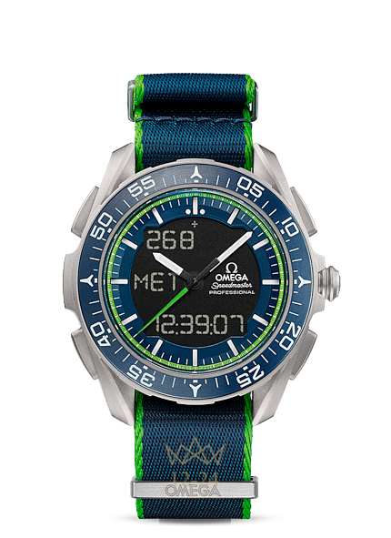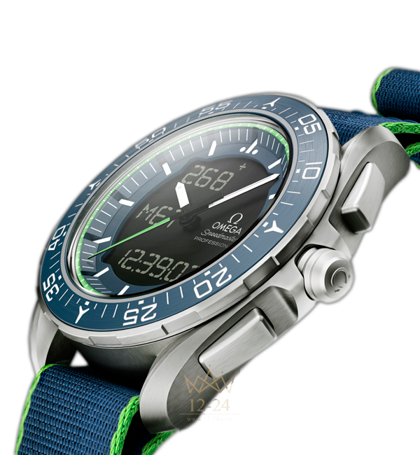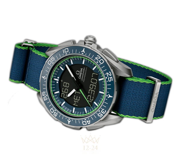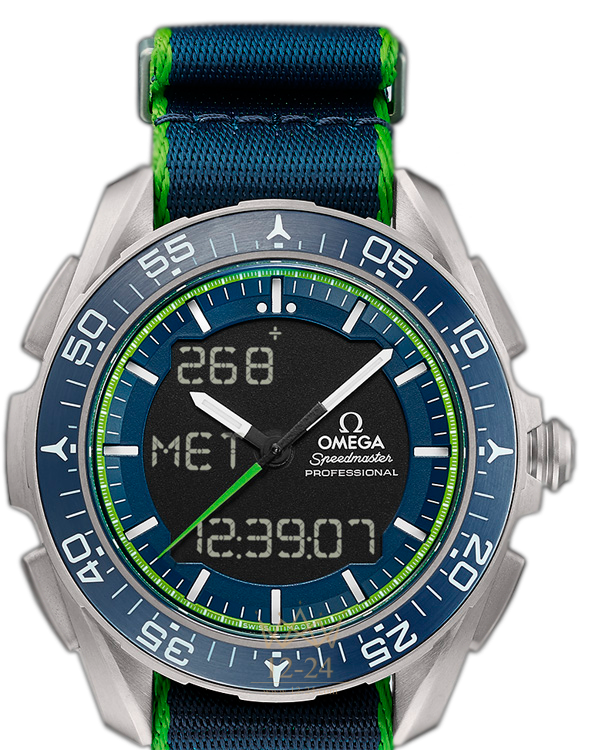 Модель Speedmaster Skywalker X-33 Solar Impulse Limited Edition – это не просто яркие часы: они посвящены проекту, главная цель которого – облететь вокруг Земли на самолете, приводимом в движение исключительно солнечной энергией. В центре аналогового сине-зеленого циферблата с белыми индексами и часовыми метками, нанесенными переводным способом и покрытыми белым люминесцентным составом Super-LumiNova, находится жидкокристаллический цифровой дисплей. Часы Speedmaster Skywalker X-33 Solar Impulse Limited Edition из титана 2 оснащены многофункциональным кварцевым часовым механизмом с хронографом OMEGA, калибр 5619. На их задней крышке из титана Grade 2 выштампованы эмблема Solar Impulse «Around the World», название модели и надпись «TESTED AND QUALIFIED BY ESA» (ESA – Европейское космическое агентство). Выпускаемая ограниченной серией из 1924 экземпляров модель дополнена ремешком NATO из полиамида синего цвета с зеленой окантовкой.