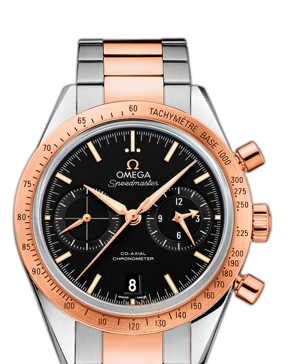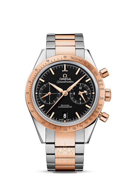 OMEGA Speedmaster – одни из самых культовых часов OMEGA. Побывав во всех шести лунных экспедициях, легендарные часы Speedmaster стали впечатляющим символом, выражающим первопроходческий дух марки OMEGA. Эта выдержанная в духе легендарного первоисточника модель имеет черный циферблат с малой секундной стрелкой в положении «9 часов» и совмещенными 12-часовым и 60-минутным счетчиками на вспомогательном циферблате в положении «3 часа». Имеются также центральная стрелка хронографа и окошко указателя даты в положении «6 часов». Эффектный циферблат защищен устойчивым к царапинам сапфировым стеклом. Безель из 18-каратного розового золота с тахиметрической шкалой закреплен на корпусе диаметром 41,50 мм из нержавеющей стали, который дополнен браслетом из 18-каратного розового золота и нержавеющей стали. Основу этих часов составляет калибр 9300 – первый коаксиальный часовой механизм OMEGA с хронографом.