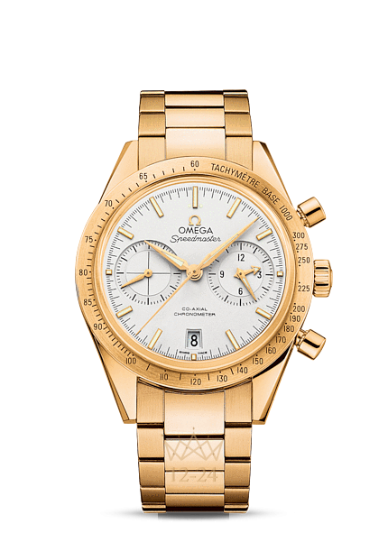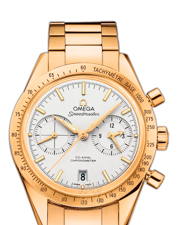 OMEGA Speedmaster – одни из самых культовых часов OMEGA. Побывав во всех шести лунных экспедициях, легендарные часы Speedmaster стали впечатляющим символом, выражающим перво-проходческий дух марки OMEGA. Эта модель, созданная под вдохновением от первых часов OMEGA Speedmaster 1957 года, имеет серебристый циферблат с малой секундной стрелкой в положении «9 часов» и совмещенными 12-часовым и 60-минутным счетчиками на вспомогательном циферблате в положении «3 часа». Имеются также центральная стрелка хронографа и окошко указателя даты в положении «6 часов». Эффектный циферблат защищен устойчивым к царапинам сапфировым стеклом. Сатинированный безель с тахиметрической шкалой закреплен на корпусе диаметром 41,50 мм из 18-каратного желтого золота с золотым браслетом. Основу этого хронографа составляет революционный коаксиальный часовой механизм OMEGA, калибр 9301.