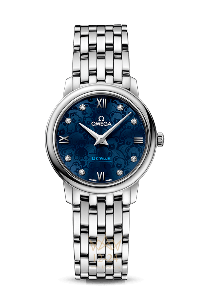 Модель диаметром 27,4 мм с корпусом из нержавеющей стали имеет лакированный синий циферблат с радиальным сатинированием, на который нанесен многослойный узор OMEGA в виде плюшевого медвежонка. Специально для этой коллекции также был разработан логотип – плюшевый медвежонок, украшающий заднюю крышку с вертикальным сатинированием.