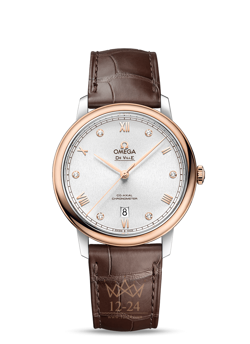 Модель из нержавеющей стали и 18-каратного розового золота имеет серебристый циферблат с радиальным сатинированием, рельефной вертикальной текстурой и минутной шкалой в стиле "железная дорога". Окошко указателя даты в положении "6 часов", логотип OMEGA, оригинальные римские цифры, оправа бриллиантов и стрелки с покрытием из розового золота.