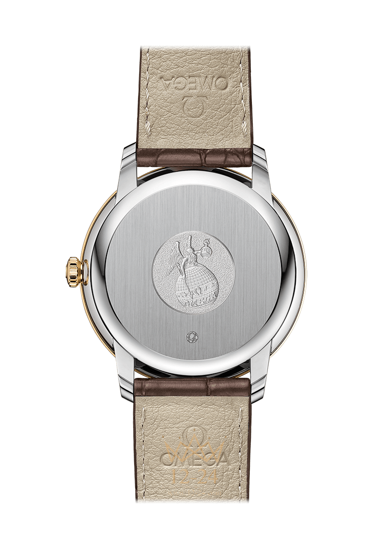 Модель из нержавеющей стали и 18-каратного желтого золота имеет циферблат из золота Moonshine с PVD-покрытием, радиальным сатинированием, рельефной вертикальной текстурой и минутной шкалой в стиле "железная дорога". Окошко указателя даты в положении "6 часов", логотип OMEGA, оригинальные римские цифры, оправа бриллиантов и стрелки с покрытием из желтого золота.