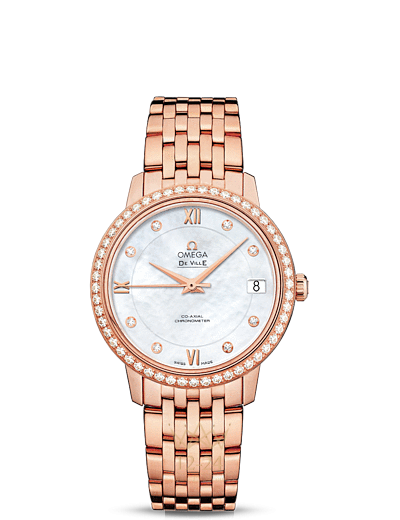 Коллекция OMEGA De Ville Prestige завоевала любовь поклонников бренда своим классическим элегантным дизайном. Входящие в нее модели отличаются чистотой линий, роскошной отделкой и вневременной эстетикой. Данная модель имеет впечатляющий белый перламутровый циферблат с делением на две зоны, бриллиантовыми часовыми метками и выполненными из золота римскими цифрами в положениях «6 часов», «9 часов» и «12 часов». Эффектный циферблат с окошком указателя даты в положении «3 часа» защищен устойчивым к царапинам сапфировым стеклом. Украшенный бриллиантами безель закреплен на корпусе диаметром 32,7 мм из 18-каратного красного золота, который дополнен браслетом из 18-каратного красного золота. Основу этой модели составляет коаксиальный калибр 2500.