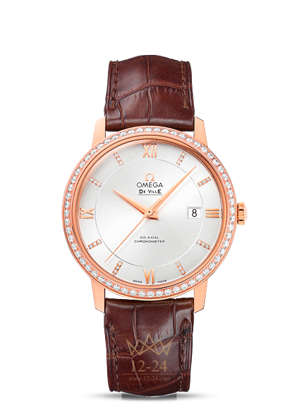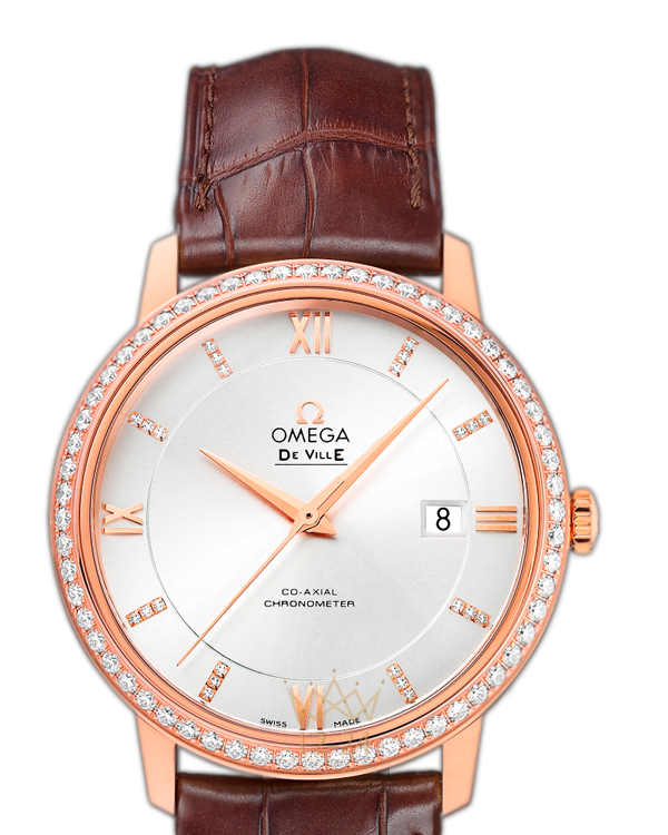 Коллекция OMEGA De Ville Prestige завоевала любовь поклонников бренда своим классическим элегантным дизайном. Входящие в нее модели отличаются чистотой линий, роскошной отделкой и вневременным дизайном. Данная модель имеет серебристый циферблат с делением на две зоны, бриллиантовыми часовыми метками и выполненными из золота римскими цифрами в положениях «3 часа», «6 часов», «9 часов» и «12 часов». Эффектный циферблат с окошком указателя даты в положении «3 часа» защищен устойчивым к царапинам сапфировым стеклом. Корпус диаметром 39,5 мм из 18-каратного красного золота с коричневым кожаным ремешком дополнен украшенным бриллиантами безелем. Основу этой модели составляет коаксиальный калибр 2500.