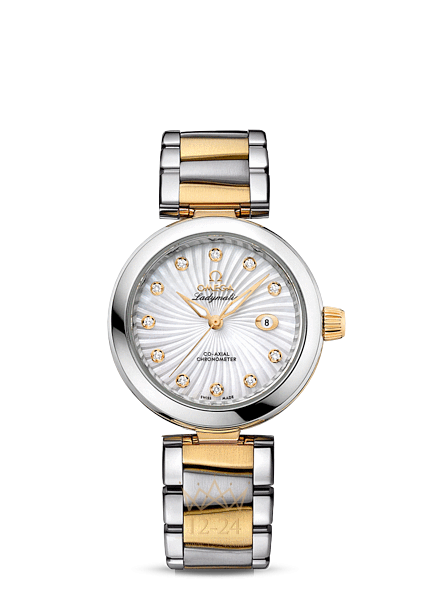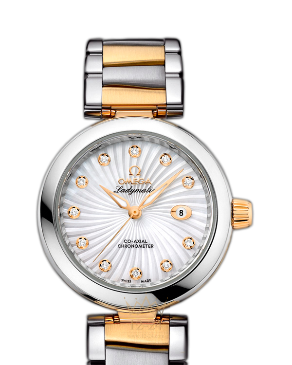Линия OMEGA Ladymatic являет собой притягательное сочетание неординарного дизайна и новаторского подхода к часовому искусству. Она разработана специально для представительниц прекрасного пола, которые выбирают себе часы не только по внешнему виду, но и по их техническим характеристикам. Эта модель OMEGA Ladymatic имеет чисто-белый перламутровый циферблат с бриллиантовыми часовыми метками, узором Supernova и окошком указателя даты в положении «3 часа». Изысканный циферблат защищен устойчивым к царапинам сапфировым стеклом. Полированный корпус диаметром 34 мм из нержавеющей стали дополнен биметаллическим браслетом из нержавеющей стали и 18-каратного желтого золота. Торец корпуса украшен кольцом волнистого рельефа с белой керамической вставкой. Прозрачная задняя крышка позволяет в деталях рассмотреть коаксиальный калибр OMEGA 8520.