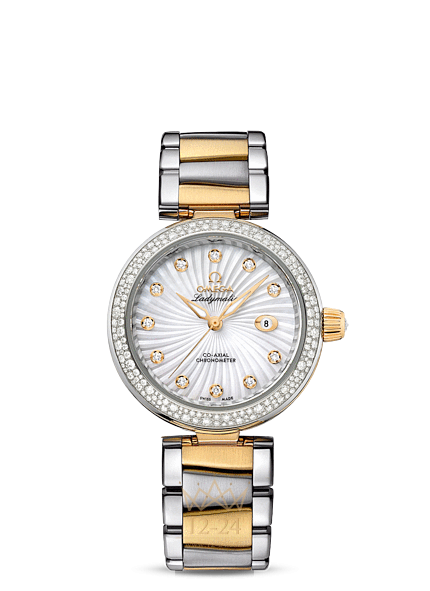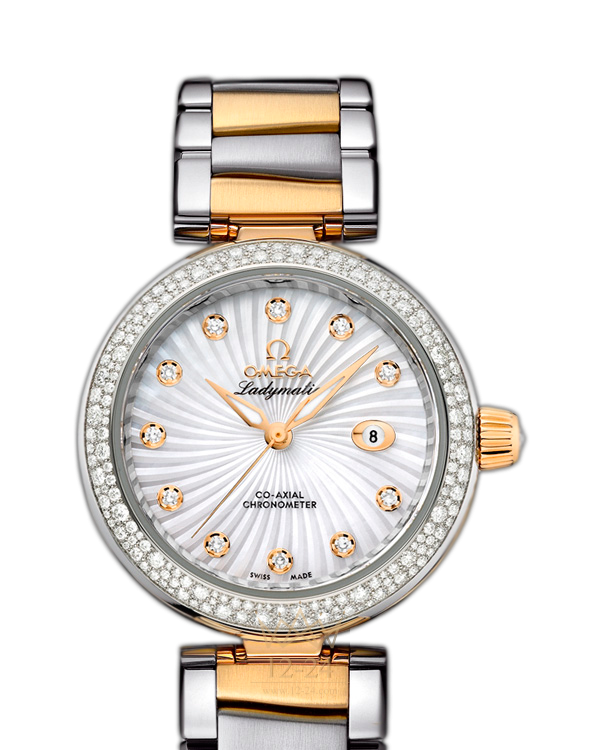 Линия OMEGA Ladymatic являет собой притягательное сочетание неординарного дизайна и новаторского подхода к часовому искусству. Она разработана специально для представительниц прекрасного пола, которые выбирают себе часы не только по внешнему виду, но и по их техническим характеристикам. Эта модель OMEGA Ladymatic имеет чисто-белый перламутровый циферблат с бриллиантовыми часовыми метками, узором Supernova и окошком указателя даты в положении «3 часа». Изысканный циферблат защищен устойчивым к царапинам сапфировым стеклом. Украшенный разноразмерными бриллиантами безель закреплен на корпусе диаметром 34 мм из нержавеющей стали, который дополнен биметаллическим браслетом из нержавеющей стали и 18-каратного желтого золота. Торец корпуса украшен кольцом волнистого рельефа с белой керамической вставкой. Прозрачная задняя крышка позволяет в деталях рассмотреть коаксиальный калибр OMEGA 8520.