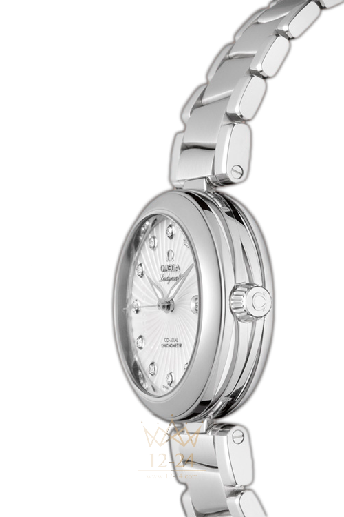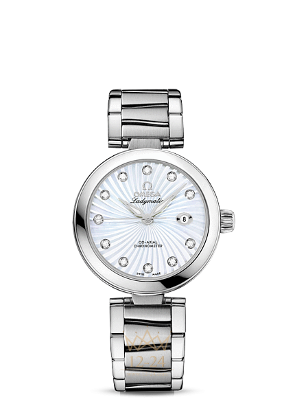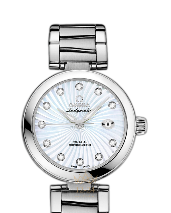 Линия OMEGA Ladymatic являет собой притягательное сочетание неординарного дизайна и новаторского часового искусства. Она разработана специально для представительниц прекрасного пола, которые выбирают себе часы не только по внешнему виду, но и по их техническим характеристикам. Данная модель OMEGA Ladymatic имеет белый перламутровый циферблат с бриллиантовыми часовыми метками, звездным узором и окошком указателя даты в положении «3 часа». Изысканный циферблат защищен устойчивым к царапинам сапфировым стеклом. Корпус диаметром 34 мм из нержавеющей стали с браслетом из нержавеющей стали дополнен элегантным безелем. Кольцо из нержавеющей стали с волнистым узором и внутренней вставкой из белой керамики украшает боковую сторону корпуса. Прозрачная задняя крышка позволяет в деталях рассмотреть коаксиальный калибр OMEGA 8520.