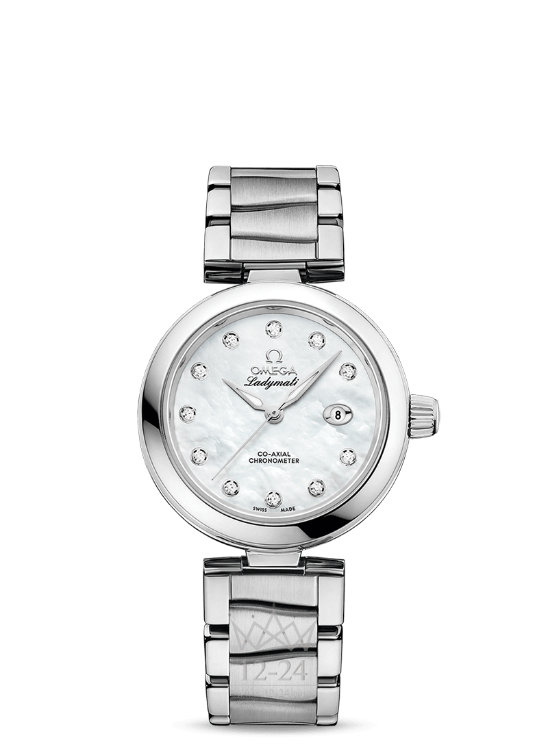 У данной модели часовой корпус, насчитывающий в диаметре 34 мм, и браслет изготовлены из нержавеющей стали. Полированные стрелки формы «альфа» состоят из белого золота, как и 11 украшенных бриллиантами индексов. Дополнительный женственный акцент часам придает красивый циферблат из белого перламутра с жемчужным узором.