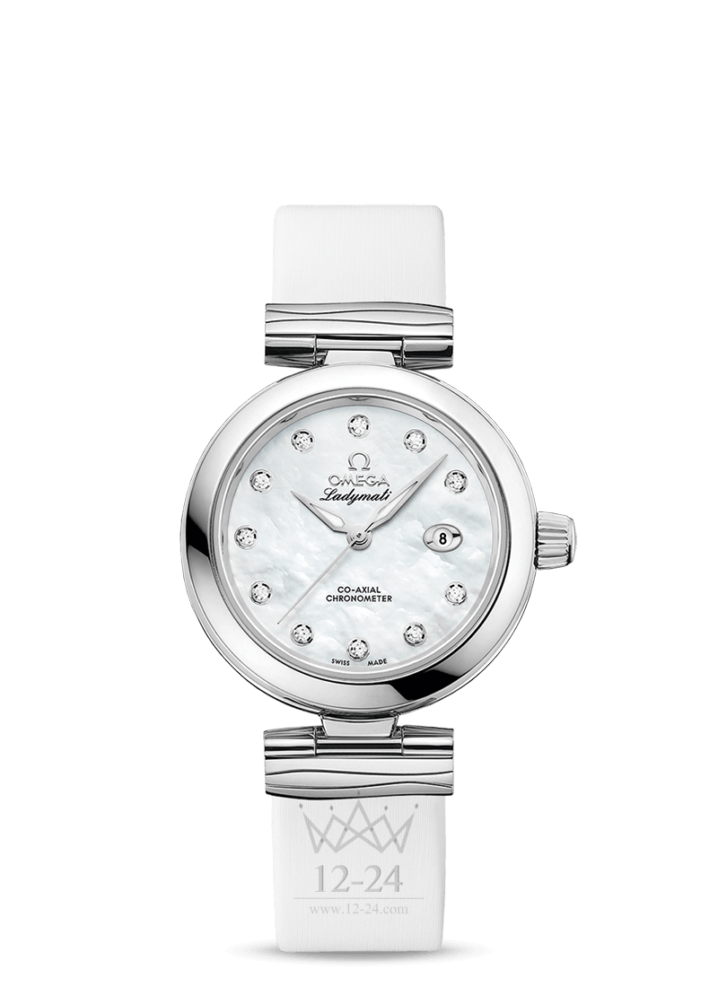 Дополнительный женственный акцент часам придает красивый циферблат из белого перламутра.