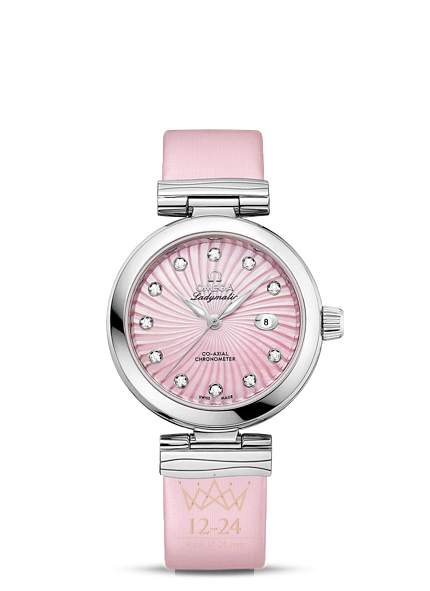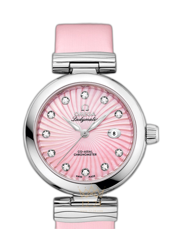 Линия OMEGA Ladymatic являет собой притягательное сочетание неординарного дизайна и новаторского подхода к часовому искусству. Она разработана специально для представительниц прекрасного пола, которые выбирают себе часы не только по внешнему виду, но и по их техническим характеристикам. Данная модель OMEGA Ladymatic имеет розовый перламутровый циферблат с бриллиантовыми часовыми метками, звездным узором и окошком указателя даты в положении «3 часа». Изысканный циферблат защищен устойчивым к царапинам сапфировым стеклом. Корпус диаметром 34 мм из нержавеющей стали с розовым ремешком из сатинированной кожи дополнен элегантным безелем. Кольцо из нержавеющей стали с волнистым узором и внутренней вставкой из розовой керамики украшает боковую сторону корпуса. Прозрачная задняя крышка позволяет в деталях рассмотреть коаксиальный калибр OMEGA 8520.