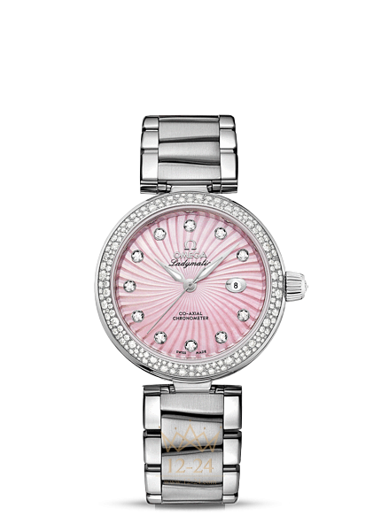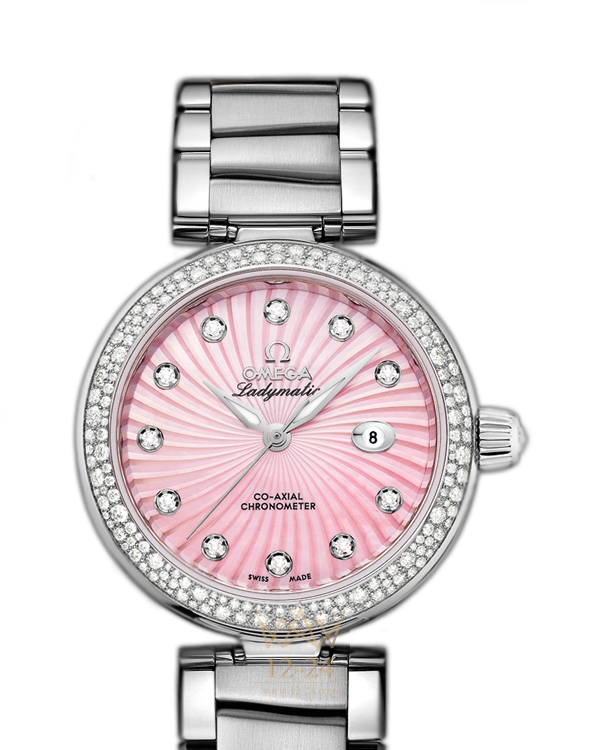 Линия OMEGA Ladymatic являет собой притягательное сочетание неординарного дизайна и новаторского подхода к часовому искусству. Она разработана специально для представительниц прекрасного пола, которые выбирают себе часы не только по внешнему виду, но и по их техническим характеристикам. Данная модель OMEGA Ladymatic имеет розовый перламутровый циферблат с бриллиантовыми часовыми метками, звездным узором и окошком указателя даты в положении «3 часа». Изысканный циферблат защищен устойчивым к царапинам сапфировым стеклом. Корпус диаметром 34 мм из нержавеющей стали с браслетом из нержавеющей стали дополнен элегантным безелем с бриллиантами. Кольцо из нержавеющей стали с волнистым узором и внутренней вставкой из розовой керамики украшает боковую сторону корпуса. Прозрачная задняя крышка позволяет в деталях рассмотреть коаксиальный калибр OMEGA 8520.