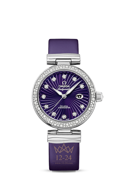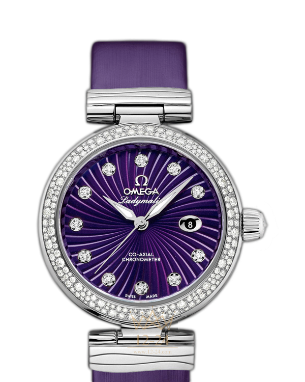 Линия OMEGA Ladymatic являет собой притягательное сочетание неординарного дизайна и новаторского подхода к часовому искусству. Она разработана специально для представительниц прекрасного пола, которые выбирают себе часы не только по внешнему виду, но и по их техническим характеристикам. Данная модель имеет фиолетовый циферблат с бриллиантовыми часовыми метками, звездным узором и окошком указателя даты в положении «3 часа». Изысканный циферблат защищен устойчивым к царапинам сапфировым стеклом. Корпус из нержавеющей стали диаметром 34 мм с фиолетовым ремешком из сатинированной кожи дополнен безелем, украшенным образующими снежный узор бриллиантами. Кольцо из нержавеющей стали с волнистым узором и внутренней вставкой из черной керамики украшает боковую сторону корпуса. Прозрачная задняя крышка позволяет в деталях рассмотреть коаксиальный калибр OMEGA 8520.