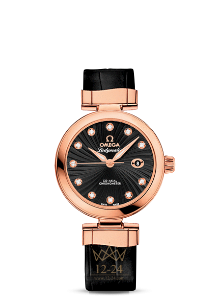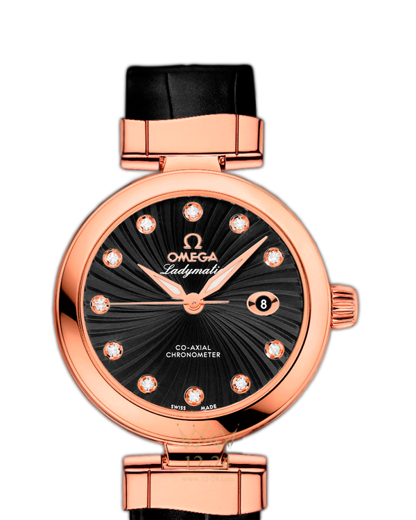 Линия OMEGA Ladymatic являет собой притягательное сочетание неординарного дизайна и новаторского часового искусства. Она разработана специально для представительниц прекрасного пола, которые выбирают себе часы не только по внешнему виду, но и по их техническим характеристикам. Данная модель OMEGA Ladymatic имеет черный циферблат с бриллиантовыми часовыми метками, звездным узором и окошком указателя даты в положении «3 часа». Изысканный циферблат защищен устойчивым к царапинам сапфировым стеклом. Корпус из 18-каратного красного золота диаметром 34 мм с черным кожаным ремешком дополнен элегантным безелем. Кольцо из золота с волнистым узором и внутренней вставкой из черной керамики украшает боковую сторону корпуса. Прозрачная задняя крышка позволяет в деталях рассмотреть коаксиальный калибр OMEGA 8521.