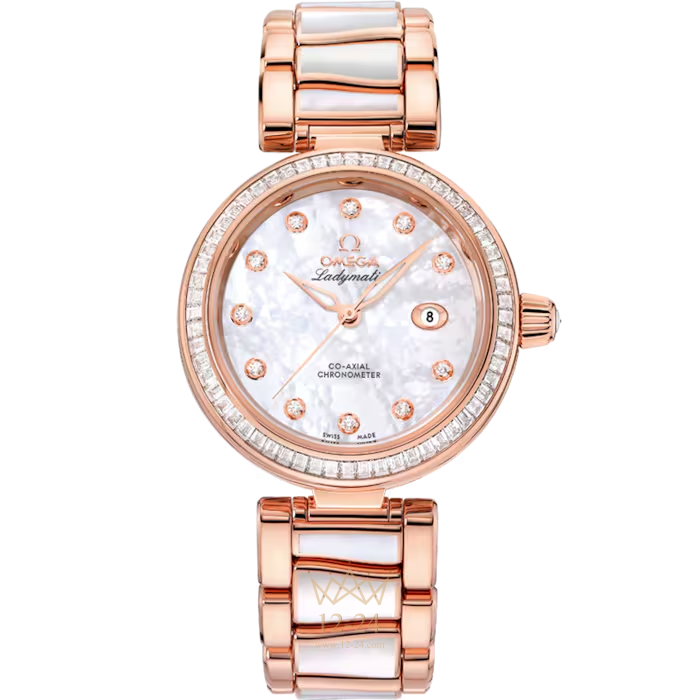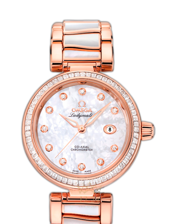 Линия OMEGA Ladymatic являет собой притягательное сочетание неординарного дизайна и новаторского подхода к часовому искусству. Она создана для представительниц прекрасного пола, которые выбирают себе часы не только по внешнему виду, но и по техническим характеристикам. Данная модель OMEGA Ladymatic имеет перламутровый циферблат с жемчужным узором и 11 бриллиантовыми часовыми метками. Изысканный циферблат защищен устойчивым к царапинам сапфировым стеклом. Безель украшен 60 бриллиантами огранки «багет» и закреплен на корпусе диаметром 34 мм из 18-каратного золота Sedna. Корпус и циферблат дополняет браслет из 18-каратного золота Sedna, у которого центральные звенья украшены перламутровыми вставками исключительной белизны. Прозрачная задняя крышка корпуса позволяет в деталях рассмотреть коаксиальный калибр OMEGA 8521.