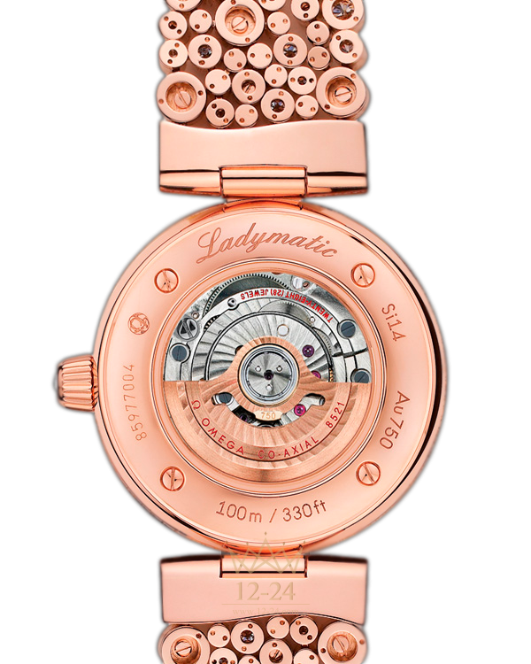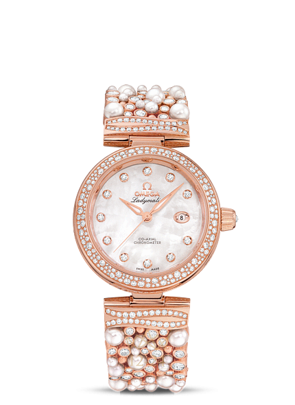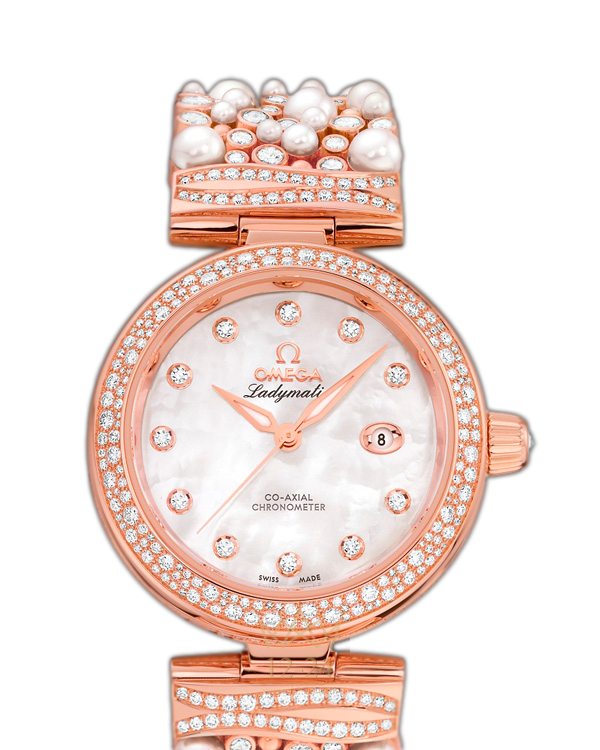 Линия OMEGA Ladymatic являет собой притягательное сочетание неординарного дизайна и новаторского подхода к часовому искусству. Она создана для представительниц прекрасного пола, которые выбирают себе часы не только по внешнему виду, но и по техническим характеристикам. Эта модель OMEGA Ladymatic имеет белый перламутровый циферблат с 11 бриллиантовыми часовыми метками и окошком указателя даты в положении «3 часа». Изысканный циферблат защищен устойчивым к царапинам сапфировым стеклом. Покрытый бриллиантовым паве безель закреплен на корпусе диаметром 34 мм из 18-каратного золота Sedna™ , который дополнен восхитительным браслетом с белым жемчугом Akoya, «жемчужинами» из 18-каратного золота Sedna и 312 бриллиантами. Прозрачная задняя крышка корпуса позволяет в деталях рассмотреть коаксиальный калибр OMEGA 8521.