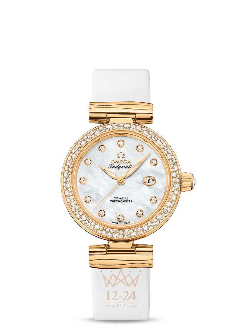 Белый жемчужно — перламутровый циферблат обрамлен безелем с паве из разноразмерных бриллиантов. Полированная заводная головка украшена бриллиантом огранки «Brilliant OMEGA Cut».