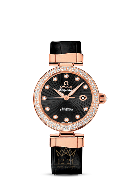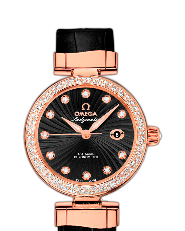 Линия OMEGA Ladymatic являет собой притягательное сочетание неординарного дизайна и новаторского часового искусства. Она разработана специально для представительниц прекрасного пола, которые выбирают себе часы не только по внешнему виду, но и по их техническим характеристикам. Данная модель OMEGA Ladymatic имеет черный циферблат с бриллиантовыми часовыми метками, звездным узором и окошком указателя даты в положении «3 часа». Изысканный циферблат защищен устойчивым к царапинам сапфировым стеклом. Корпус из 18-каратного красного золота диаметром 34 мм с черным кожаным ремешком дополнен безелем, украшенным образующими снежный узор бриллиантами. Кольцо из золота с волнистым узором и внутренней вставкой из черной керамики украшает боковую сторону корпуса. Прозрачная задняя крышка позволяет в деталях рассмотреть коаксиальный калибр OMEGA 8521.