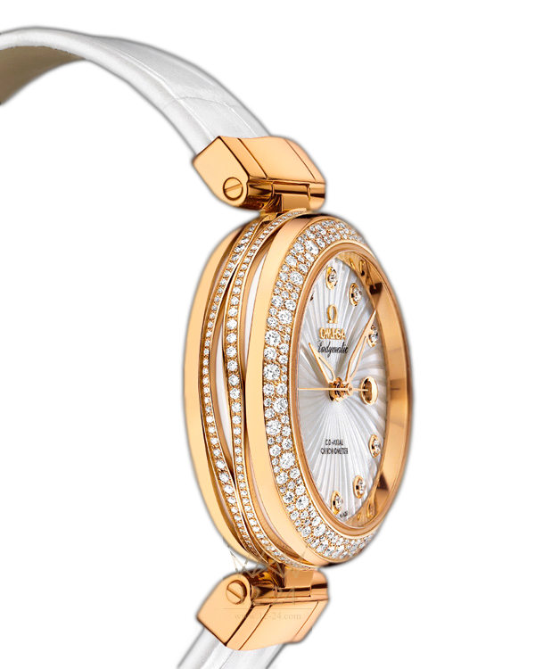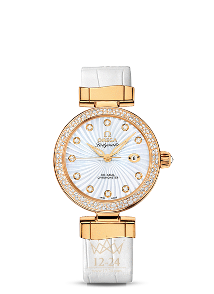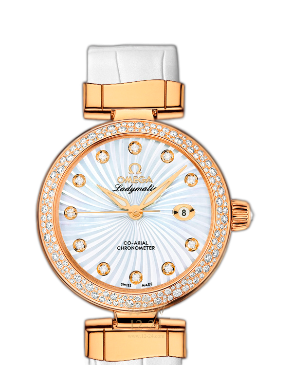 Линия OMEGA Ladymatic являет собой притягательное сочетание неординарного дизайна и новаторского часового искусства. Она разработана специально для представительниц прекрасного пола, которые выбирают себе часы не только по внешнему виду, но и по их техническим характеристикам. Данная модель OMEGA Ladymatic имеет белый перламутровый циферблат с бриллиантовыми часовыми метками, звездным узором и окошком указателя даты в положении «3 часа». Изысканный циферблат защищен устойчивым к царапинам сапфировым стеклом. Корпус из 18-каратного желтого золота диаметром 34 мм с белым кожаным ремешком дополнен безелем, украшенным образующими снежный узор бриллиантами. Кольцо из золота с волнистым узором и внутренней вставкой из белой керамики украшает боковую сторону корпуса. Прозрачная задняя крышка позволяет в деталях рассмотреть коаксиальный калибр OMEGA 8521.