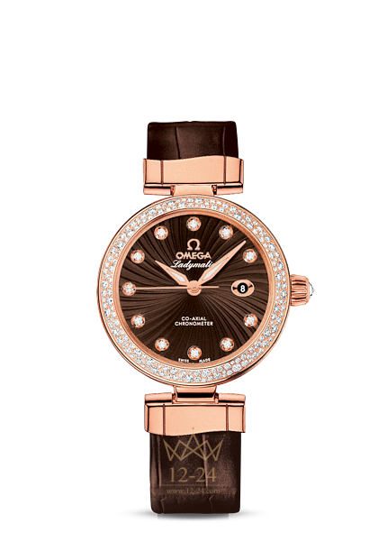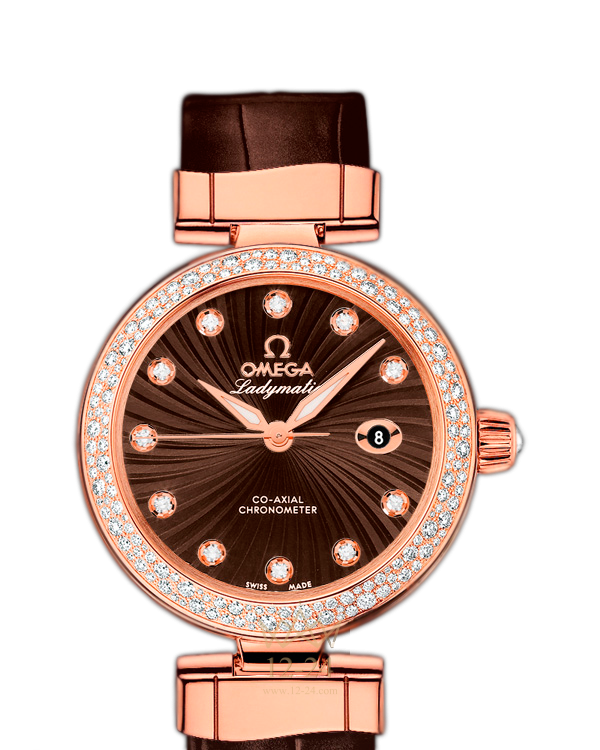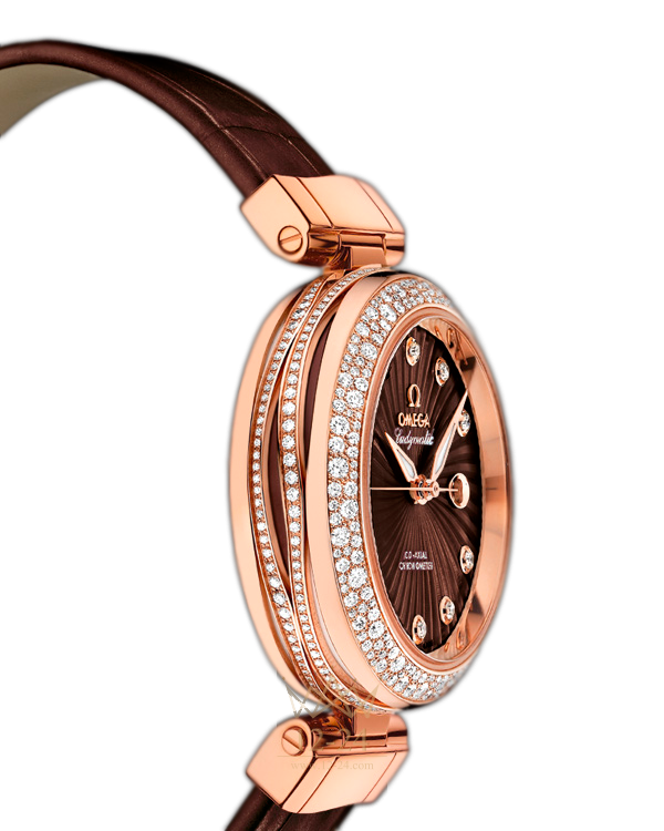 Линия OMEGA Ladymatic являет собой притягательное сочетание неординарного дизайна и новаторского подхода к часовому искусству. Она разработана специально для представительниц прекрасного пола, которые выбирают себе часы не только по внешнему виду, но и по их техническим характеристикам. Данная модель имеет коричневый циферблат с бриллиантовыми часовыми метками, звездным узором и окошком указателя даты в положении «3 часа». Изысканный циферблат защищен устойчивым к царапинам сапфировым стеклом. Корпус из 18-каратного розового золота диаметром 34 мм с коричневым кожаным ремешком дополнен безелем, украшенным образующими снежный узор бриллиантами . Украшенное бриллиантами кольцо из золота с волнистым узором и внутренней вставкой из коричневой керамики украшает боковую сторону корпуса. Прозрачная задняя крышка позволяет в деталях рассмотреть коаксиальный калибр OMEGA 8521.