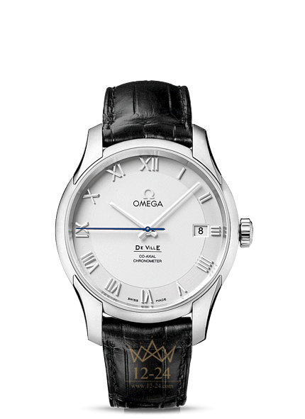 Каждая из моделей элегантной серии OMEGA De Ville характеризуется оригинальным классическим дизайном. Данная модель имеет серебристый циферблат с делением на две зоны с римскими цифрами и окошком указателя даты в положении «3 часа». Эффектный циферблат защищен устойчивым к царапинам сапфировым стеклом. Корпус диаметром 41 мм из нержавеющей стали с черным кожаным ремешком дополнен элегантным безелем. В этой изысканной модели используется коаксиальный механизм OMEGA, калибр 8500, который хорошо виден сквозь прозрачную заднюю крышку.