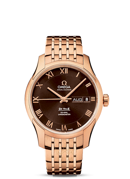 Каждая из моделей элегантной серии OMEGA De Ville характеризуется оригинальным классическим дизайном. Данная модель имеет коричневый циферблат с делением на две зоны, римскими цифрами из 18-каратного золота и окошками указателей даты и месяца в положении «3 часа». Эффектный циферблат защищен устойчивым к царапинам сапфировым стеклом. Корпус диаметром 41 мм из 18-каратного красного золота с браслетом из 18-каратного красного золота дополнен элегантным безелем. В этой изысканной модели используется коаксиальный механизм OMEGA, калибр 8611, который хорошо виден сквозь прозрачную заднюю крышку.