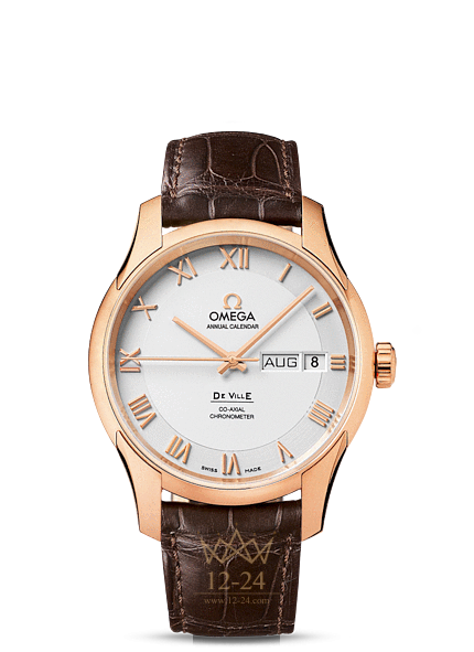 Каждая из моделей элегантной серии OMEGA De Ville характеризуется оригинальным классическим дизайном. Данная модель имеет серебристый циферблат с делением на две зоны, римскими цифрами из 18-каратного золота и окошками указателей даты и месяца в положении «3 часа». Эффектный циферблат защищен устойчивым к царапинам сапфировым стеклом. Корпус диаметром 41 мм из 18-каратного красного золота с коричневым кожаным ремешком дополнен элегантным безелем. В этой изысканной модели используется коаксиальный механизм OMEGA, калибр 8611, который хорошо виден сквозь прозрачную заднюю крышку.