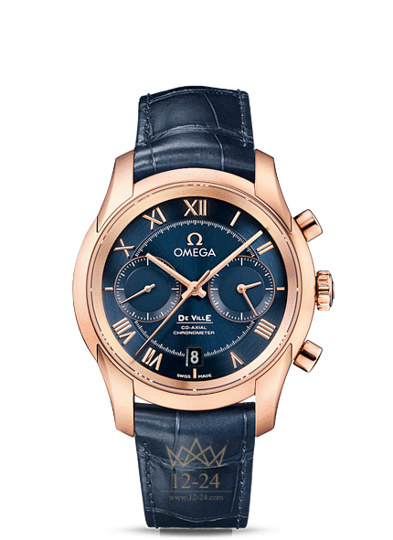 Элегантные часы OMEGA De Ville характеризуются уникальным классическим дизайном. Этот хронограф имеет синий циферблат с делением на две зоны, римскими цифрами, окошком указателя даты в положении «6 часов» и устойчивым к царапинам сапфировым стеклом. На циферблате присутствуют отдельный индикатор малой секундной стрелки, а также 60-минутный и 12-часовой счетчики, размещенные на одном индикаторе для более удобного считывания результатов хронометража. Корпус диаметром 42 мм из 18-каратного розового золота с синим кожаным ремешком дополнен элегантным безелем. В этой изысканной модели используется коаксиальный механизм OMEGA, калибр 9301, который виден сквозь прозрачную заднюю крышку корпуса.