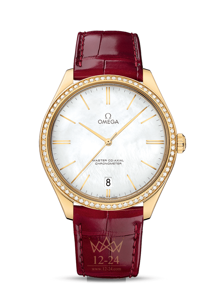Данная модель имеет выпуклый циферблат из белого перламутра с полированными стрелками из 18-каратного золота и окошком указателя даты в положении "6 часов". Женские наручные часы в корпусе диаметром 40 мм из 18-каратного желтого золота с украшенным бриллиантами безелем дополняет красный кожаный ремешок с полированной застежкой. В часах De Ville Trésor используется уникальный антимагнитный часовой механизм с ручным заводом OMEGA Master Co-Axial, калибр 8511.