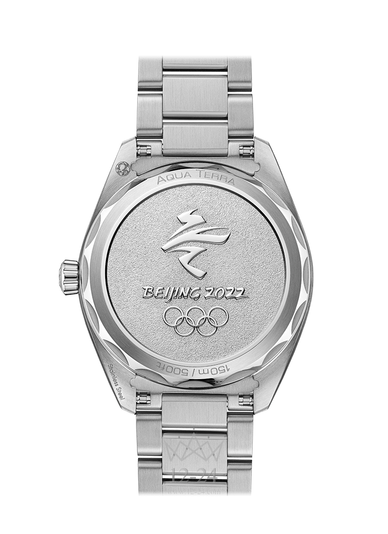 На задней крышке изображена эмблема Олимпийских игр в Пекине 2022 года, окруженная характерным волнообразным узором по краю. Часы дополнены браслетом из нержавеющей стали с запатентованной системой OMEGA "винт и стержень" и оснащены калибром OMEGA Co-Axial Master Chronometer 8900.