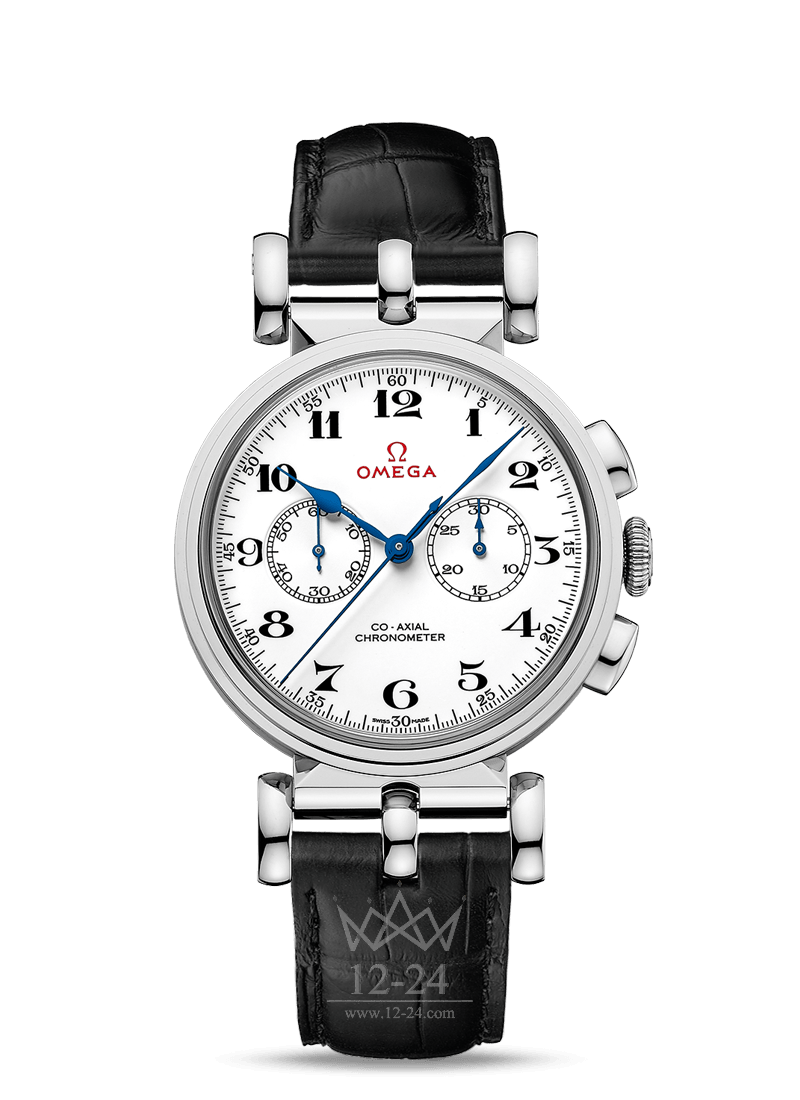 У этой модели стильный часовой корпус из 18-каратного белого золота имеет матовую заводную головку с полированным рельефным винтажным символом OMEGA. На лакированном белом циферблате винтажный символ OMEGA напечатан красным цветом. В положениях "3 часа" и "9 часов" находятся вспомогательные циферблаты с синеными стальными стрелками.