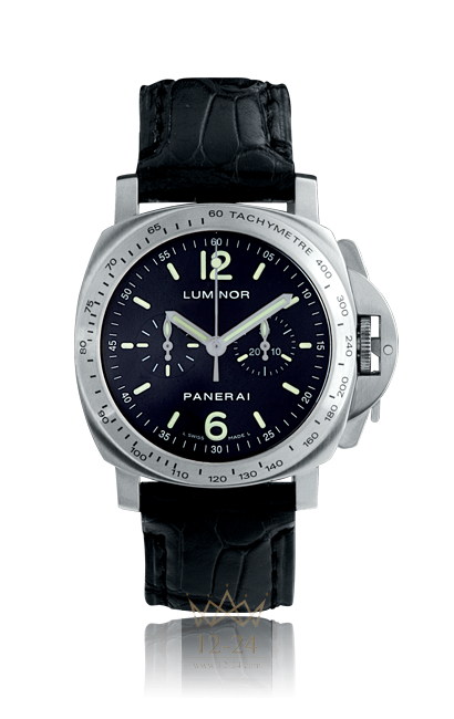 Циферблат черного цвета, со светящимися часовыми метками и арабскими цифрами. Счетчики черного цвета. Секундный циферблат в положении «9 часов», счетчик минут в положении «3 часа». Центральная стрелка хронографа. Ремешок: кожа аллигатора, черный, в тон, 22.15/20.15 MM, стандартный.