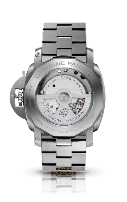 Механизм: Автоматический механизм, калибр Panerai P.9000, производство Panerai, 13¾ линии, толщина 7,9 мм, 28 камней, баланс из сплава Glucydur, 28 800 полу-колебаний/час. Противоударное устройство Incabloc. Запас хода 3 дня, два заводных барабана. 197 деталей.