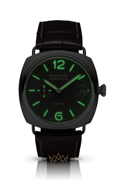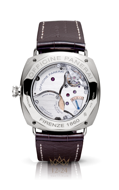 Механизм: Механический с ручным заводом, калибр Panerai P.2002/9, производство Panerai, 13¾ линии, толщина 8,2 мм, 23 камня, баланс из сплава Glucydur, 28 800 полу-колебаний/час. Противоударное устройство Kif-Parechoc. Запас хода 8 дней, три заводных барабана, система установки секундной стрелки на ноль. 245 деталей.