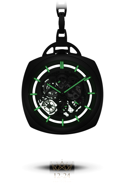 Цепочка карманных часов крепится к корпусу с помощью скелетонизированной конструкции, выполненной из черной керамики в форме защищающего заводную головку моделей Panerai Luminor характерного моста. Изготовленный в стиле морской цепи звенья имеют шарнирное соединение, обеспечивающее максимальную гибкость и надежность. После снятия цепочки путем нажатия на миниатюрную кнопку, модель Pocket Watch Tourbillon GMT Ceramica может быть использована в качестве настольных часов со специальной подставкой, также выполненной в форме фирменного моста. В подставке предусмотрено место для хранения цепочки. Модель Pocket Watch Tourbillon GMT Ceramica выпускается эксклюзивной лимитированной серией. По сложившейся традиции, карманные часы водонепроницаемы при погружении на глубину до 30 метров (3 атмосферы).