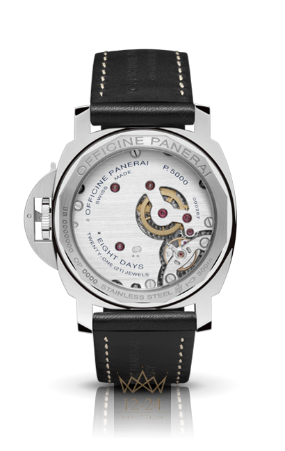 Циферблат, состоящий из двух наложенных друг на друга дисков обеспечивает ясность и оптимальную читаемость показателей. На черном фоне выделяются крупные часовые метки в форме рисок, цифры и малая секундная стрелка в положении «9 часов». Механический калибр с ручным заводом P.5000, за функционированием которого можно наблюдать через окошко с сапфировым стеклом на задней крышке, полностью разработан и изготовлен на Мануфактуре Officine Panerai в Невшателе. Механизм диаметром 15¾ линии и толщиной 4,5 мм представляет собой чрезвычайно внушительную конструкцию. Широкая платина с матовой отделкой и фасками с алмазной полировкой практически полностью закрывает механизм, но позволяет увидеть баланс с переменным моментом инерции, совершающий 21 600 полу-колебаний в час.