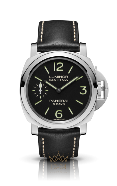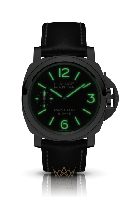 Длительный запас хода достигается за счет использования двух последовательно соединенных заводных барабанов, накапливающих энергию для 8-дневного бесперебойного функционирования. Часы Luminor Marina 8 Days входят в коллекцию Luminor и предлагаются на черном кожаном ремешке.