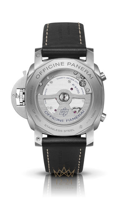 Новый выполненный из стали хронограф стал первой моделью Officine Panerai, оснащенной калибром P.9100, полностью разработанным и изготовленным на мануфактуре Officine Panerai в Невшателе. Управление функцией «мгновенного возврата» осуществляется с помощью кнопки в положении «8 часов», при нажатии на которую стрелки хронографа моментально возвращаются к нулевой отметке и незамедлительно начинают новый отсчет, что избавляет от необходимости предварительно останавливать стрелки и обнулять показания путем нажатия соответствующих кнопок. Для оптимально простого и понятного отображения показаний размещенные в центре циферблата минутная и секундная стрелки хронографа выполнены в контрастных цветах. Синяя секундная стрелка заметно отличается от стальной минутной стрелки, скачкообразно перемещающейся через каждые шестьдесят секунд.