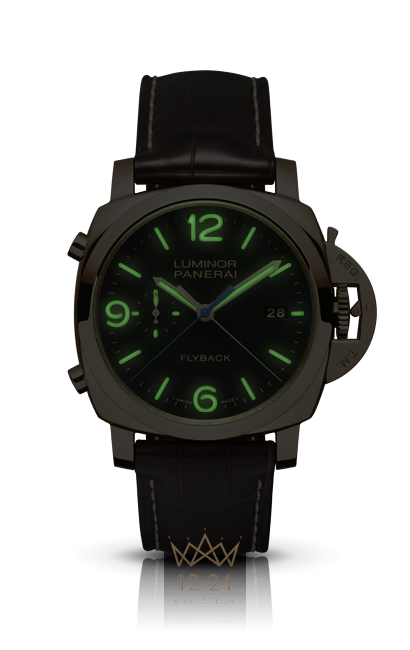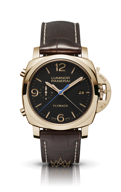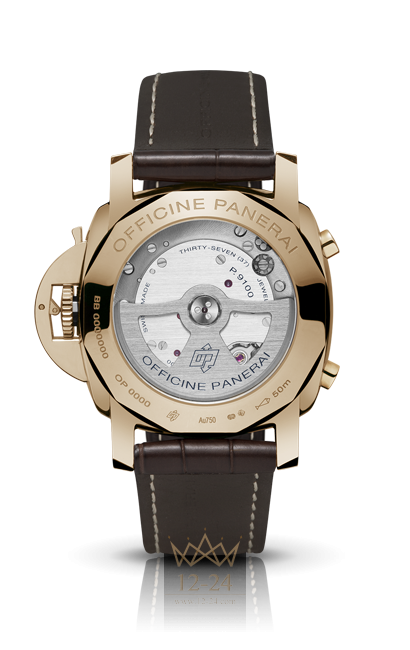Разработанная компанией Panerai в конце 1930-х годов структура циферблата гарантирует оптимальную видимость при минимальной освещенности. Циферблат состоит из двух наложенных друг на друга дисков. На верхнем диске вырезаны цифры и часовые метки, а нижний покрыт люминесцентным составом Super-LumiNova®. Корпус новой модели Luminor 1950 3 Days Chrono Flyback Oro Rosso диаметром 44 мм водонепроницаем при погружении на глубину до 50 метров (5 бар). Через большое окошко из сапфирового стекла, расположенное в центре 12-гранной задней крышки, виден механизм P.9100 мануфактурного производства. Модель Luminor 1950 3 Days Chrono Flyback Oro Rosso предлагается с коричневым ремешком из крокодиловой кожи, который легко заменяется с помощью специального устройства, интегрированного в ушки часов.