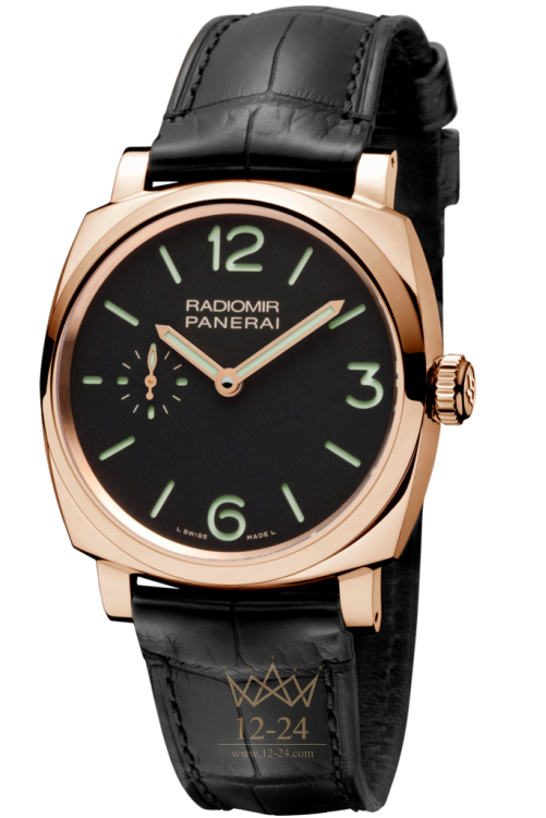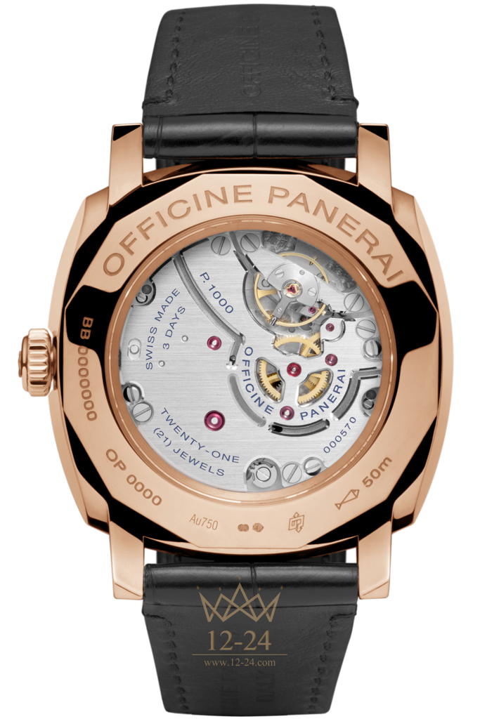 Она состоит из двух наложенных друг на друга дисков. Нижний диск покрыт люминофором, который просвечивает сквозь прорези меток на верхнем диске. Сапфировое стекло в задней крышке новых часов Radiomir 1940 3 Days позволяет рассмотреть конструкцию и отделку нового часового механизма с ручным заводом и трехдневным запасом хода, калибр P.1000, который идеально подходит по своим пропорциям к корпусу Radiomir 1940 диаметром 42 мм. Эта модель комплектуется черным ремешком из кожи аллигатора. Корпус сохраняет водонепроницаемость до 5 бар (до глубины около 50 метров).