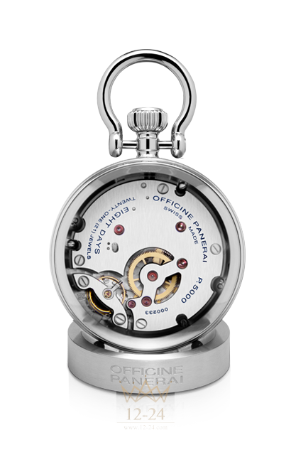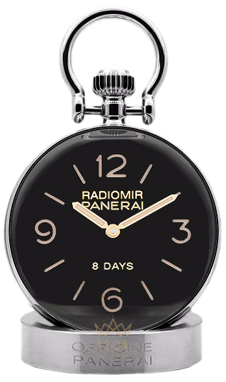 Полусфера из минерального стекла не только защищает циферблат, но и зрительно увеличивает его, позволяя лучше разглядеть другие винтажные детали, такие как выполненные методом гравировки, а не штамповки надписи «Radiomir Panerai» и «8 Days». Настольные часы – первое изделие такого типа, оснащенное собственным механическим калибром Panerai: мануфактурным механизмом P.5000. Крупная заводная головка в положении «12 часов» увенчана декоративным элементом из полированной стали в форме скобы якоря, напоминающим об исторической связи Officine Panerai с водной стихией и мореплаванием. В мореходном деле эта деталь используется обеспечения простого и надежного крепления каната или стального кабеля. Часы сферической формы установлены на круглую подставку из матовой стали с гравировкой «Officine Panerai».
