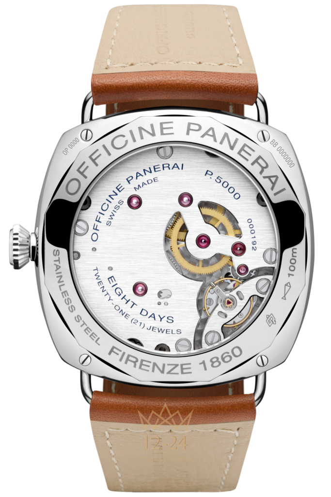 Механизм: Механический с ручным заводом, калибр P.5000, производство Panerai, 15¾ линии, толщина 4,5 мм, 21 камень, баланс из сплава Glucydur, 21 600 полу-колебаний/час. Противоударное устройство KIF Parechoc. Запас хода 8 дня, два заводных барабана. 127 деталей.