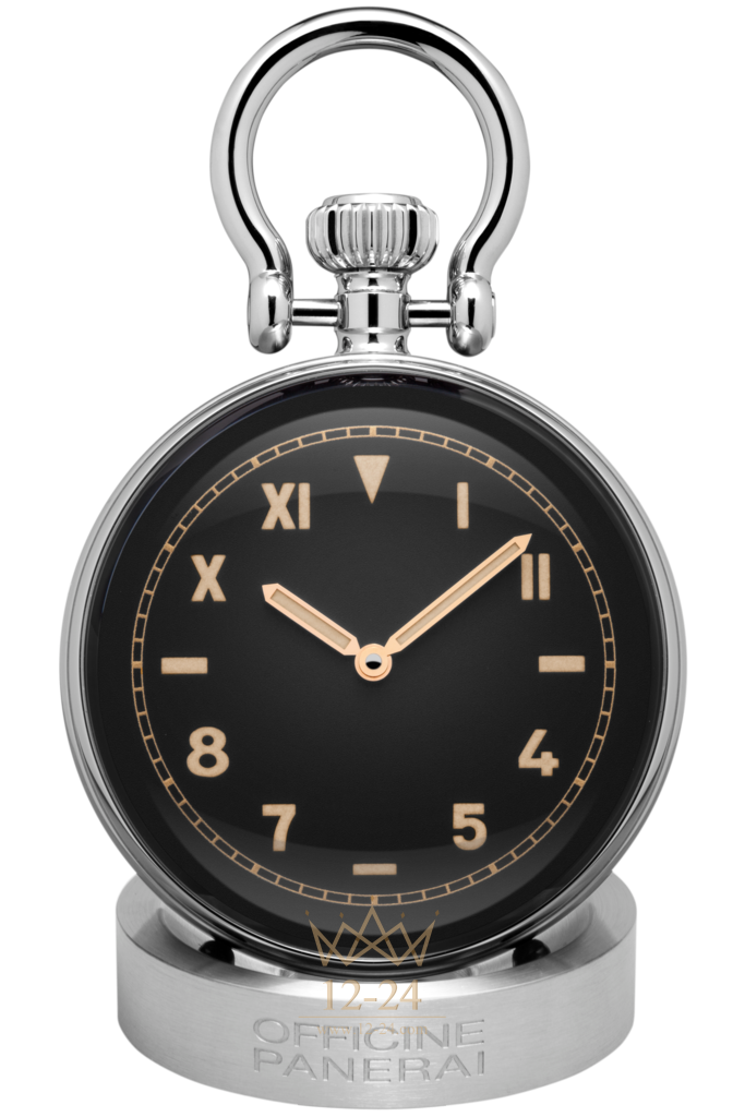Настольные часы Panerai обладают совершенством сферы: сфера из прозрачного минерального стекла заключает внутри себя циферблат, ставший частью истории часового дела, и мануфактурный часовой механизм с восьмидневным запасом хода. В обрамлении стекла находится циферблат California. Дизайн циферблата California считается самым первым в истории Panerai: такой циферблат имели еще часы, которые в 1936 году поставлялись военном-морскому флоту. Название «California» циферблат получил не так давно на волне популярности этого дизайна в Калифорнии в 1980-х годах. Почитатели бренда Panerai и коллекционеры любят этот дизайн – с чередующимися арабскими цифрами, римскими цифрами и индексами – за оригинальность и историческую значимость. Увеличительный эффект сферы позволяет хорошо разглядеть гравировку на черном циферблате, в том числе надпись «8 days», которая указывает на восьмидневный запас хода. В настольных часах использован мануфактурный калибр P.5000 с ручным заводом и восьмидневным запасом хода. Элегантная круглая подставка из матовой стали с надписью «Officine Panerai» позволяет сфере диаметром 65 мм устойчиво стоять на столе.