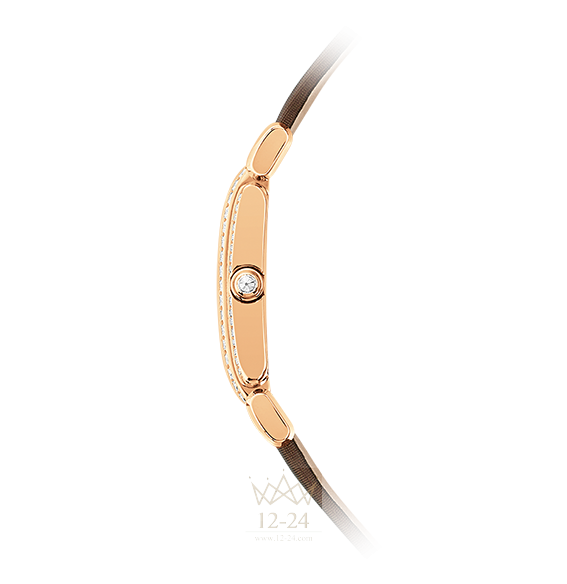 Корпус данной модели выполнен из розового золота и украшен "паве" из бриллиантов. На бриллиантовом циферблате расположились черные цифры XII и VI и черные стрелки. За индикацию часов и минут отвечает кварцевый механизм. Модель поставляется в комплекте с коричневым атласным ремешком.