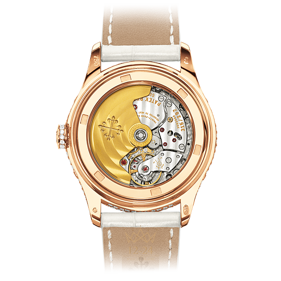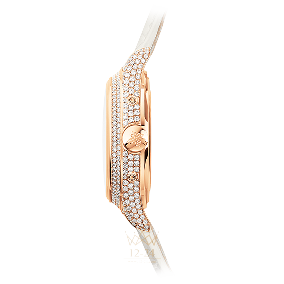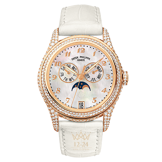 Модель с годовым календарем Annual Calendar Ladies - это ослепительная женская версия знаменитого годового календаря, настоящее воплощение женственности и хорошего вкуса. Корпус из розового золота декорирован 431 белым бриллиантом весом 2,79 карата. Кроме того, 14 бриллиантов вправлены в заводную головку, и 27 бриллиантов весом 0,2 карата украшают собой золотую застежку. На перламутровый циферблат нанесены изящные арабские цифры в стиле Breguet. В тон циферблату подобран жемчужно-белый ремешок из кожи аллигатора.