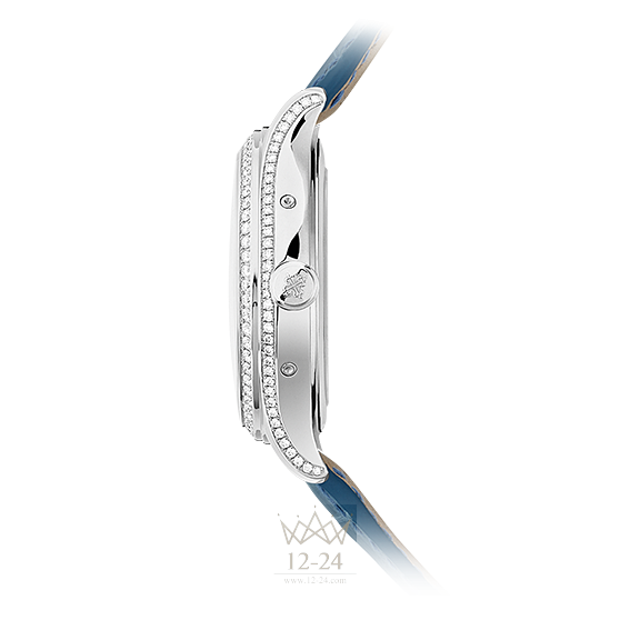 Корпус из 18-каратного белого золота декорирован белыми бриллиантами. Циферблат снабжен накладными часовыми индексами из золота. Модель укомплектована ремешком из кожи аллигатора синего цвета.