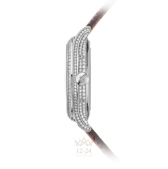 Корпус из 18-каратного белого золота декорирован 347-ю белыми бриллиантами весом 2,65 карата. Циферблат выполнен из черного таитянского перламутра. Модель укомплектована ремешком из кожи аллигатора серо-коричневого цвета.