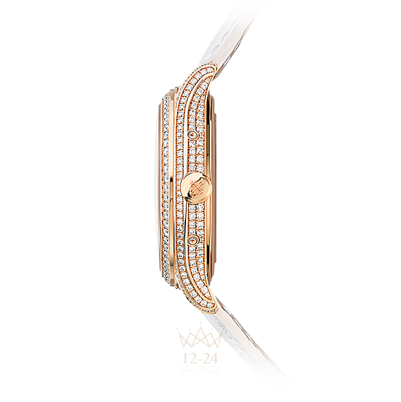 Корпус из 18-каратного розового золота декорирован 347-ю белыми бриллиантами весом 2,65 карата. Циферблат с золотыми накладными индексами выполнен из перламутра. Модель укомплектована ремешком из кожи аллигатора белого цвета.
