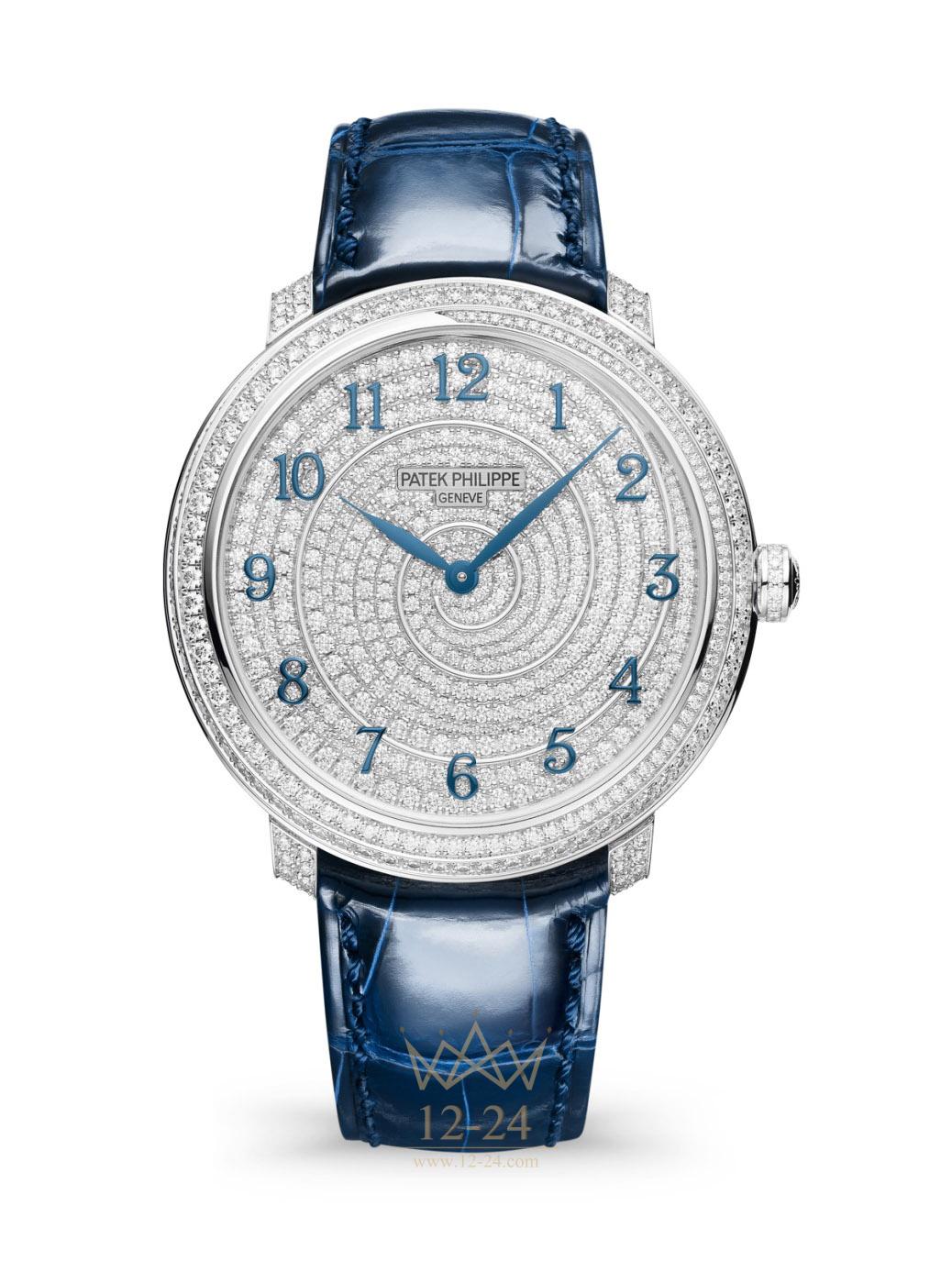 Модель Patek Philippe Diamond Ribbon — Ювелирное искусство предлагается в новой версии (4978/400G-001) чуть более крупного размера, диаметр часов из белого золота с 33,3 мм был увеличен до 36,5 мм. Это позволило сделать еще более выразительной характерную декоративную отделку из калиброванных бриллиантов, которые, словно закрученная спиралью гимнастическая лента, обвивают корпус и витками драгоценного вихря покрывают циферблат.