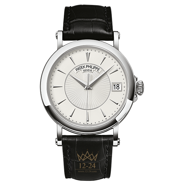 Patek Philippe представляет классический хронометр Calatrava, выдержанный в стиле офицерских часов 30-х годов. Корпус из белого золота несет как фирменные черты культовой коллекции Calatrava, так и характерные особенности офицерских часов: безукоризненно отполированный безель, прямые ушки на золотых винтах крепящиеся к ремешку, рифленая заводная головка-луковица, и наконец откидывающаяся задняя крышка. При нажатии на секретную кнопку золотая крышка отскакивает, открывая вид на сапфировое стекло, под которым работает великолепно обработанный автоматический калибр 324 S C. Вы можете понаблюдать за вращением ротора из 21-каратного золота, украшенного гравировкой. Центр черного циферблата украшен узором гильоше, который играет в лучах света. По внешнему диаметру идут накладные часовые индексы из золота в виде наконечников копья, часовая и минутная стрелки выполнены в неизменном стиле "дофин".