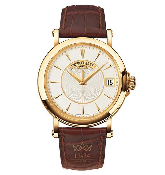 Patek Philippe представляет классический хронометр Calatrava, выдержанный в стиле офицерских часов 30-х годов. Корпус из желтого золота несет как фирменные черты культовой коллекции Calatrava, так и характерные особенности офицерских часов: безукоризненно отполированный безель, прямые ушки на золотых винтах крепящиеся к ремешку, рифленая заводная головка-луковица, и наконец откидывающаяся задняя крышка. При нажатии на секретную кнопку золотая крышка отскакивает, открывая вид на сапфировое стекло, под которым работает великолепно обработанный автоматический калибр 324 S C. Вы можете понаблюдать за вращением ротора из 21-каратного золота, украшенного гравировкой. Центр бело-серебристого циферблата украшен узором гильоше, который играет в лучах света. По внешнему диаметру идут накладные часовые индексы из золота в виде наконечников копья, часовая и минутная стрелки выполнены в неизменном стиле "дофин".